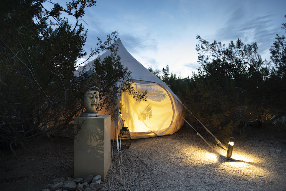 Evening light glows from a tent where private sessions unfold beneath the desert sky. ›